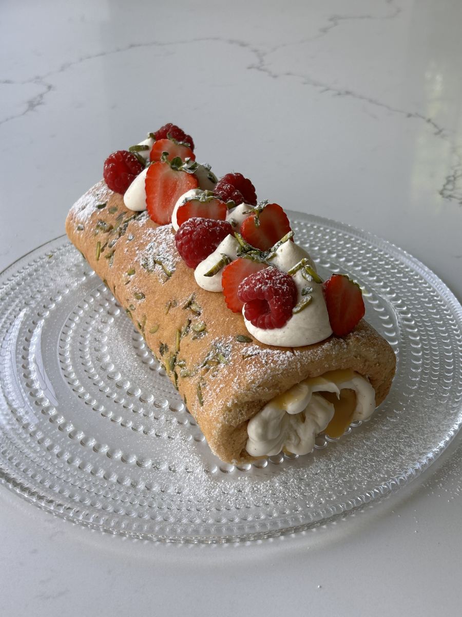 Once cooled, unravel the roulade. Use a palette knife to spread the roulade evenly with lime curd followed by a generous layer of Crème Chantilly. Scatter with fresh slices berried. Carefully roll the roulade up using the baking paper to help and transfer to a serving plate.